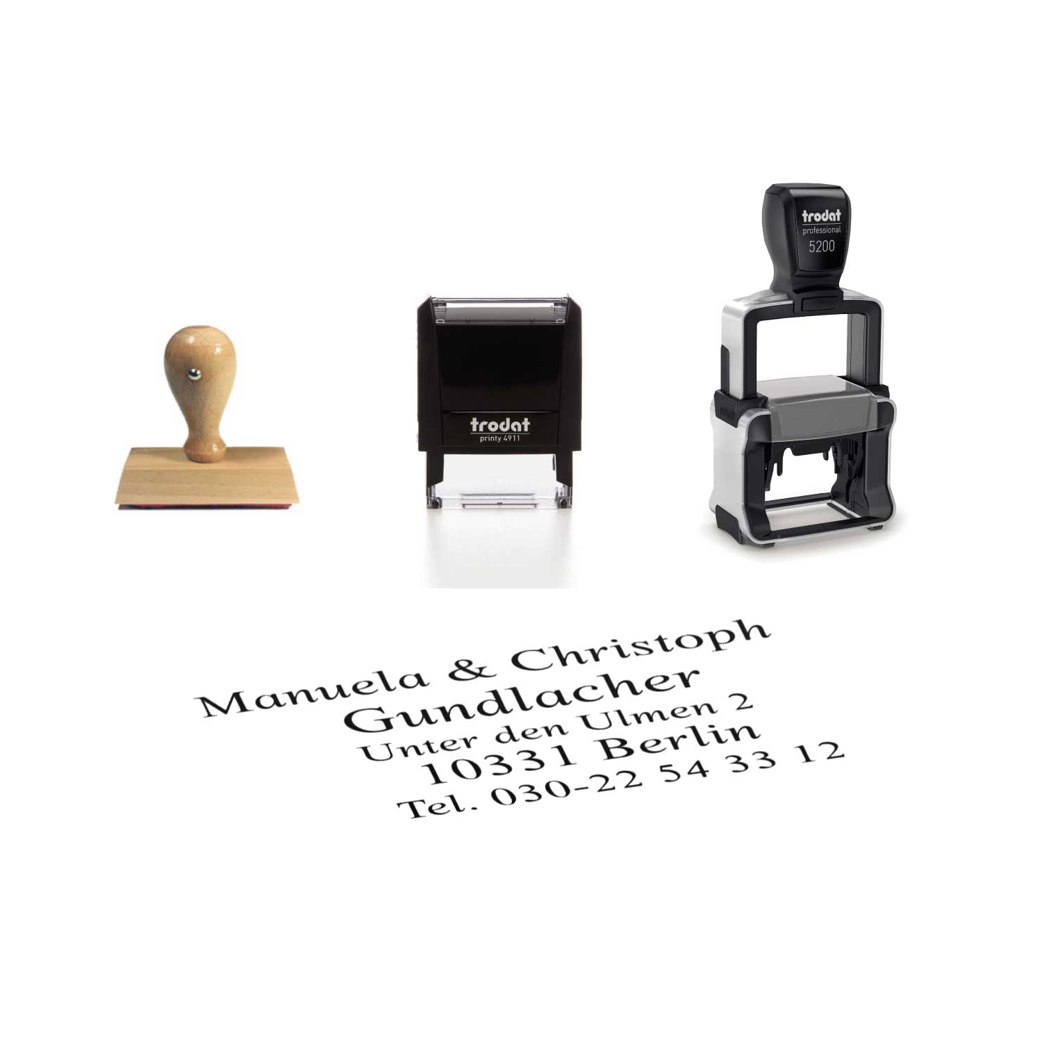 Wählen Sie zwischen einem klassischen Holzstempel oder einem praktischen Stempelautomaten (TRODAT) – beide Varianten garantieren eine saubere, langlebige Gravur und ein professionelles Druckbild.