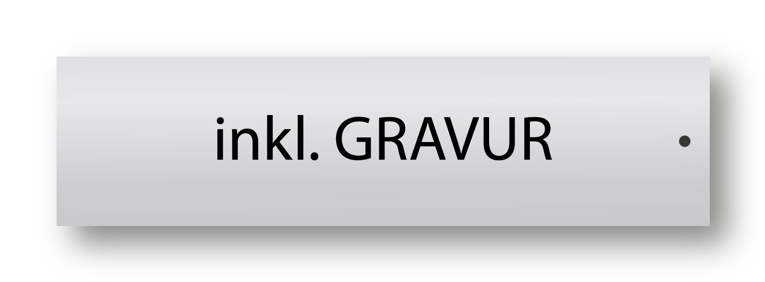 Der Preis verseht sich inkl. einer Fräsgravur. Geben Sie den Text in das entsprechende Feld auf dieser Seite ein. Der Text kann auch mehrzeilig sein. Mehr als 3 Zeilen werden nicht empfohlen. Der Text wird von uns immer mittig auf dem Schild angepasst. Die Fräsgravur kann in verschiedenen Farben ausgelegt werden (schwarz, weiß, rot, blau).