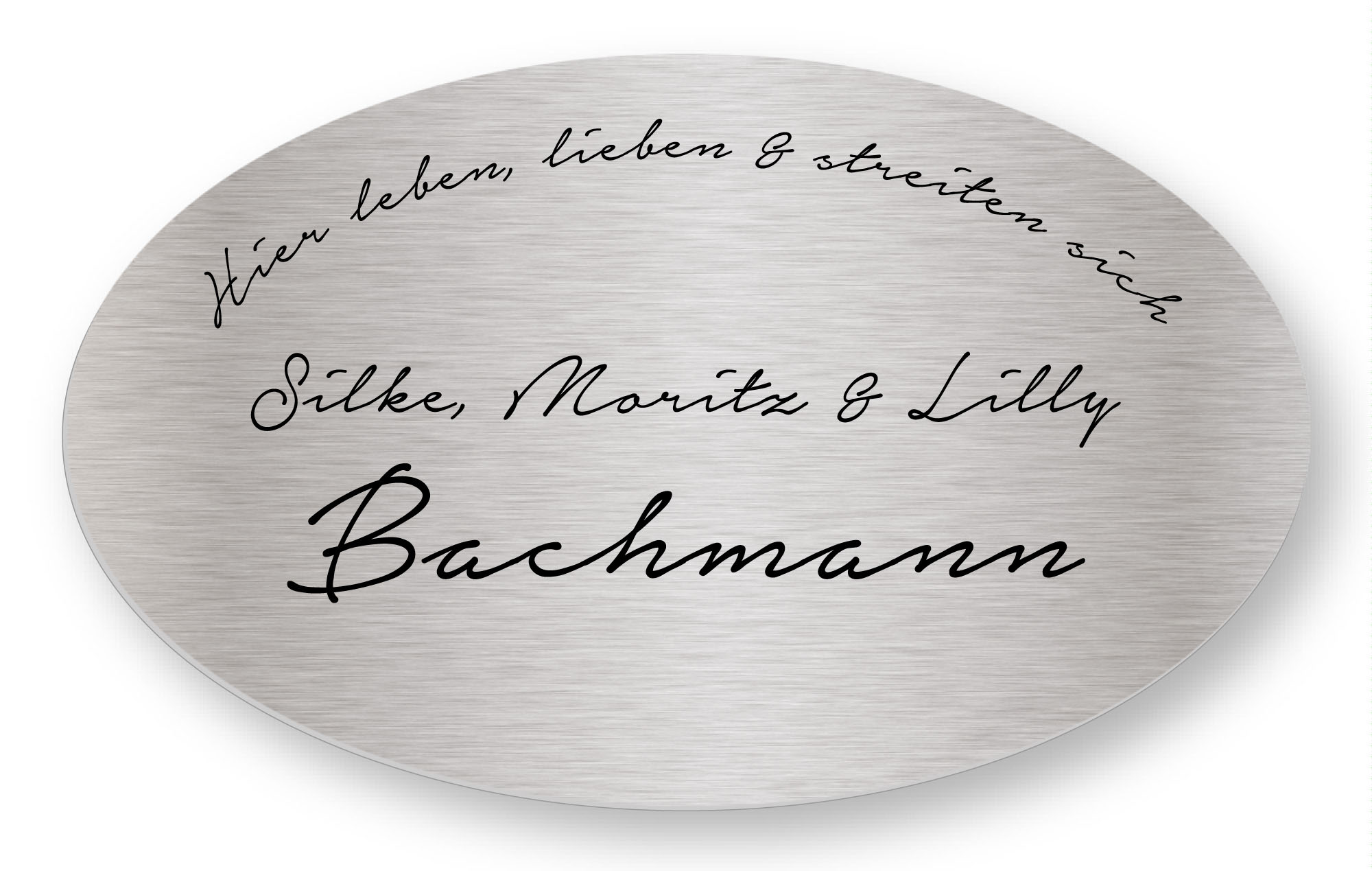 Ovales Schild aus reinem, hochwertigen V2a Edelstahl "Made in Germany". Als Türschild, Büroschild oder auch als Schild zur Widmung einer Sitzbank. Das Schild ist absolut wetterfest.